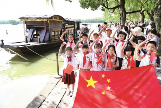 南湖紅船旁,嘉興南湖區東柵中心小學和杭州師范大學附屬嘉興經開實驗小學的學生們在瞻仰紅船,用敬禮表達拳拳愛國之情。