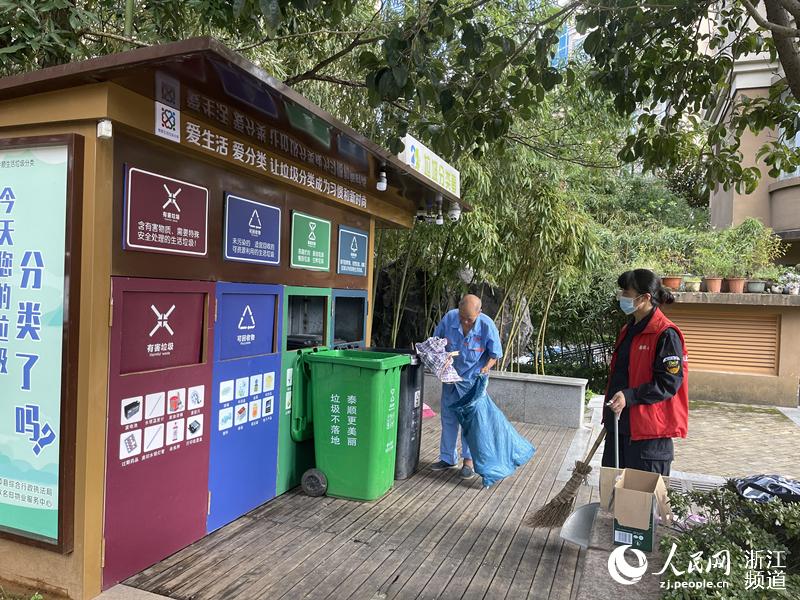 康欣名邸小區2018年率先在泰順縣試點垃圾分類,試行僅一年后,就被評為省級垃圾分類示范點。小區物業經理蘇苗壯自豪地介紹起了管理經驗:為了做好整個小區的垃圾分類工作,節假日、周末物業工作人員會挨家挨戶上門發放宣傳單,現場手把手指導過垃圾分類;另外,在4個垃圾投放點位上,每天早8點到晚8點,都有專人在一旁勸導!拔覀冊略掠性u比,曬出紅黑榜,對于垃圾分類到位的業主進行積分兌換獎勵,對于垃圾分類做得不好的業主進行批評教育,時間長了大家自然而然就養成了垃圾分類的好習慣!碧K苗壯說。