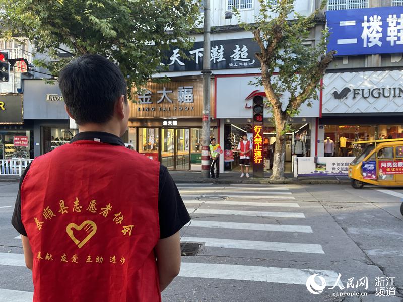 泰順城區路口,志愿者們正在進行交通勸導。人民網 王蕭蕭攝