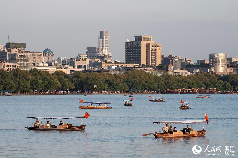 國慶期間,游客泛舟西湖。人民網 秦文攝