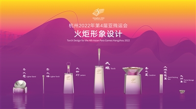 10月9日,在杭州市楊綾子學校舉行的杭州2022年第4屆亞殘運會倒計時一周年主題活動上,杭州亞殘運會火炬形象“桂冠”正式發布!肮鸸凇,通體月桂黃與虹韻紫交相輝映,整體高756毫米,凈重1160克,與亞運火炬“薪火”形成一種相互呼應關系。