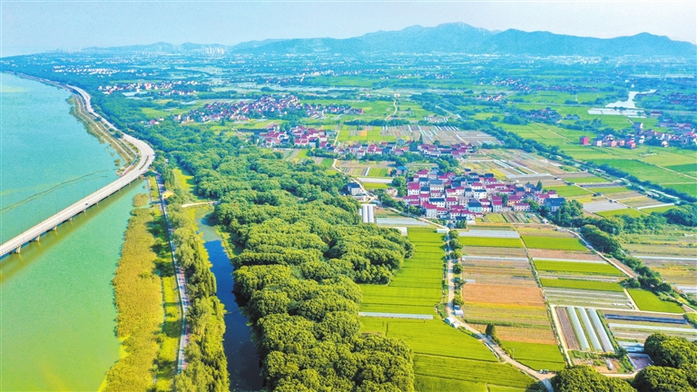 俯瞰太湖邊的湖州新塘村,曬魚場改造成的蔬菜大棚和稻田一片生機盎然。自太湖退捕后,新塘村黨委協助成立精品蔬菜合作社,近2000名漁民轉產種植有機蔬菜,新建大棚蔬菜1000多畝,采收季節每天能為周邊地區供應6000多公斤優質蔬菜。(吳拯)