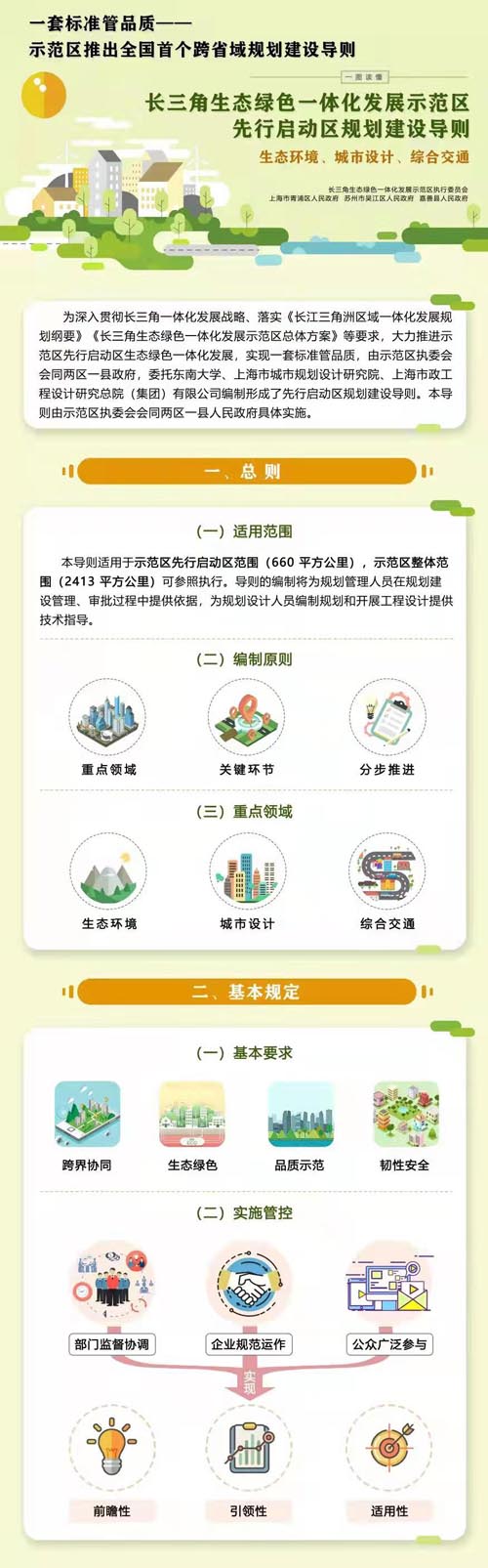 作為全國第一部跨省域的規劃建設導則,長三角一體化示范區重點突出跨界協同、突出生態綠色、突出品質示范、突出韌性安全。主要亮點包括:跨域一體,明確需要共同遵守的規劃管控底線與標準;探索“就高不就低”的規劃標準;實施“水、林、田、鎮、村”全要素綜合管控;統籌底線管控與彈性發展。