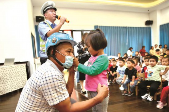 10月14日是重陽節,嘉興港區交警大隊結合“一盔一帶”安全守護行動,走進中南實驗幼兒園,針對老年人和小朋友開展“祝福重陽 關愛老人”交通安全宣傳活動。在交警的引導下,小朋友們給爺爺奶奶佩戴上了安全頭盔。(王蓉、張金杰)