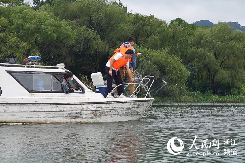 工作人員在茅家埠采樣點收網。人民網 秦文攝