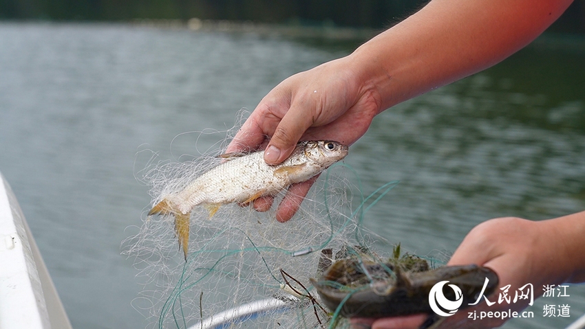 茅家埠采樣點網捕到的黃顙魚和黃尾密鲴。人民網 秦文攝