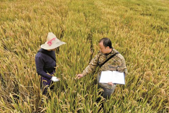 10月21日,在嘉興市農科院水稻育種基地,一大片金燦燦的水稻豐收在望,農科人員正在稻田進行考察,根據水稻品種的表現優中選優,培育良種。(馮玉坤)