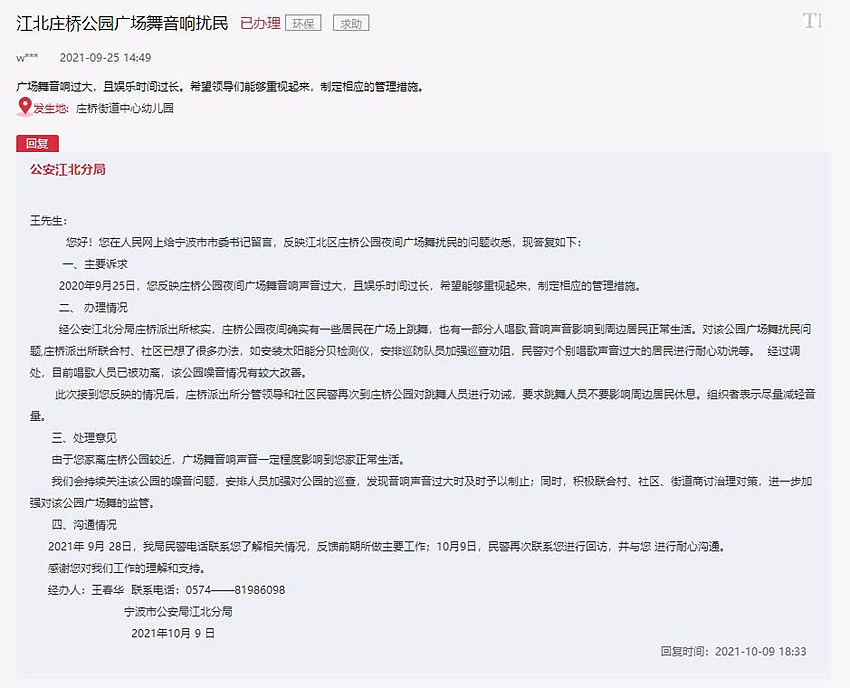 針對寧波江北莊橋公園的廣場舞噪聲問題,江北公安分局表示,會持續關注該公園的噪聲問題,安排人員加強對公園的巡查,發現音響聲音過大時及時予以制止;積極聯合村(社區)、街道商討治理對策,進一步加強對該公園廣場舞的監管。
