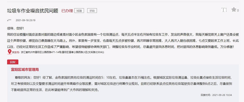 針對早晨垃圾車清運造成的噪聲問題,杭州市富陽區城市管理局根據城區實際垃圾清運量、垃圾處置點接收生活垃圾時間、環衛考核細則以及交警要求清運時間避開早高峰作業等因素,對城區垃圾進行統籌作業規劃。目前已聯系該點位其他垃圾車駕駛員盡量調整到6點之后,不影響居民正常生活。
