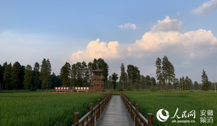9月初,天長市水稻田里的觀景臺,襯著夕陽格外顯眼。人民網 汪瑞華攝
