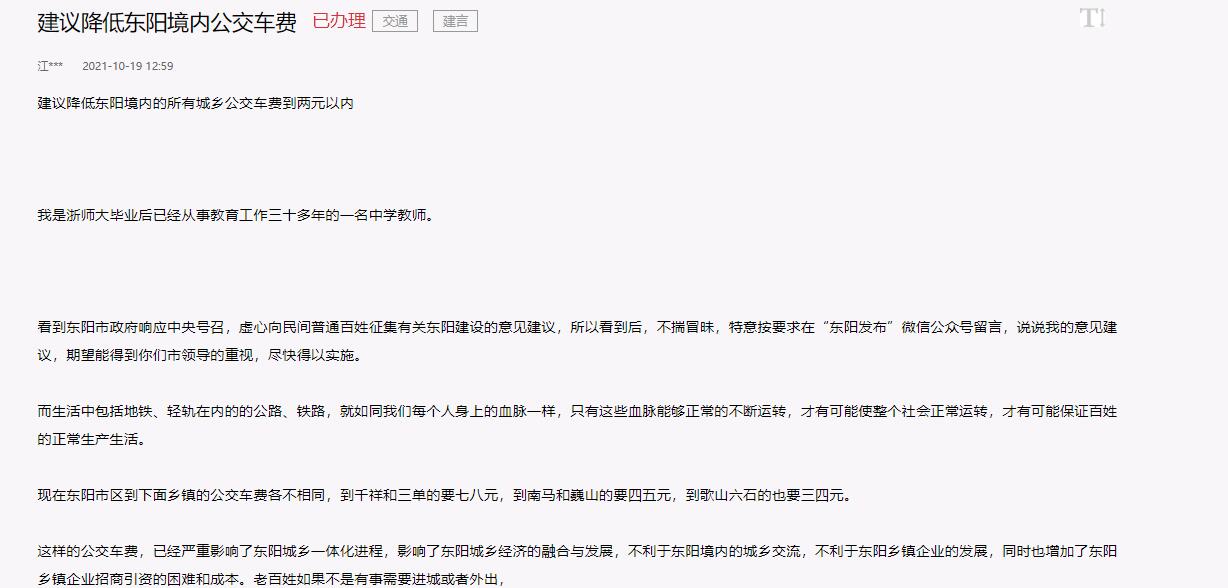 “經調查,2015年10月1日東陽市完成城鄉公交一體化改造,實現公司化經營和公車公營!稏|陽市城鄉公交一體化改造實施方案》規定,‘改造后,根據成本定價的原則,城鄉公交票價按照物價部門核定的客運票價執行’,東陽市區到各鄉鎮的公交車費按里程計費,實行公路階梯票價機制,故不相同!贬槍W友提出的“降低東陽市境內公交車費”建議,浙江東陽市交通運輸局工作人員回應將予以部分采納。