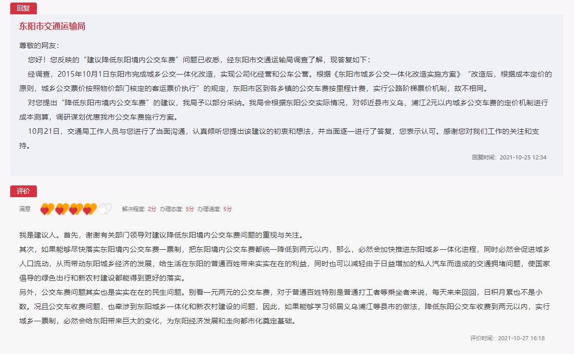 東陽市交通運輸局在回應中表示:我局會根據東陽公交實際情況,對鄰近縣市義烏、浦江2元以內城鄉公交車費的定價機制進行成本測算,調研謀劃優惠東陽公交車費施行方案。