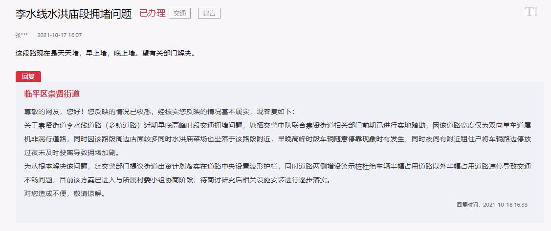 臨平區崇賢街道在回復中表示,為從根本上解決該問題,經交警部門提議,街道計劃在道路中央設置波形護欄,同時在道路兩側增設警示樁,杜絕車輛違停導致交通不暢問題。目前,該方案已進入與所屬村委小組協商階段,待商討研究后將逐步落實相關設施安裝工作。