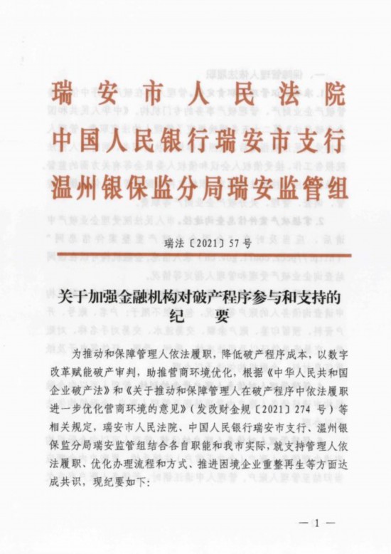 溫州瑞安法院、金融監管部門加強金融機構參與和支持破產程序