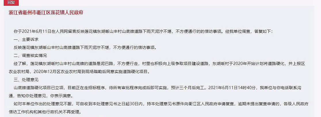 群眾的呼聲,政府看在眼里。留言發表后,衢州市蓮花鎮人民政府相關部門馬上實地核實情況,并進行了回應。
