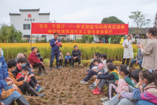11月6日下午,嘉興海寧市硤石街道南漾村舉行“一粒米,千滴汗——養成勤儉節約的良好美德”活動,組織本村50組父母和子女下到稻田,體驗割稻、運稻、拾稻穗等活動。同時,邀請關工委長者、農技人員和老村干部講解水稻生產的歷史,讓小朋友們體會到前輩的辛勞,懂得糧食的來之不易。(石月平)