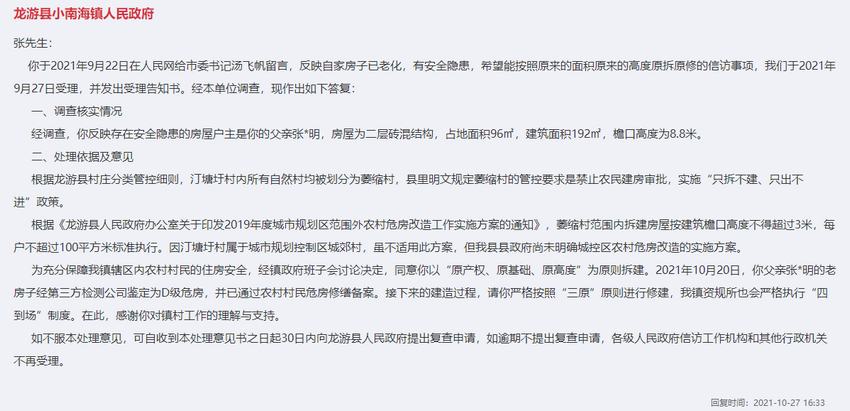 龍游縣小南海鎮工作人員在走訪中了解到,該網友房屋為二層磚混結構,占地面積96平方米,建筑面積192平方米,檐口高度為8.8米。房屋老化,存在安全隱患。