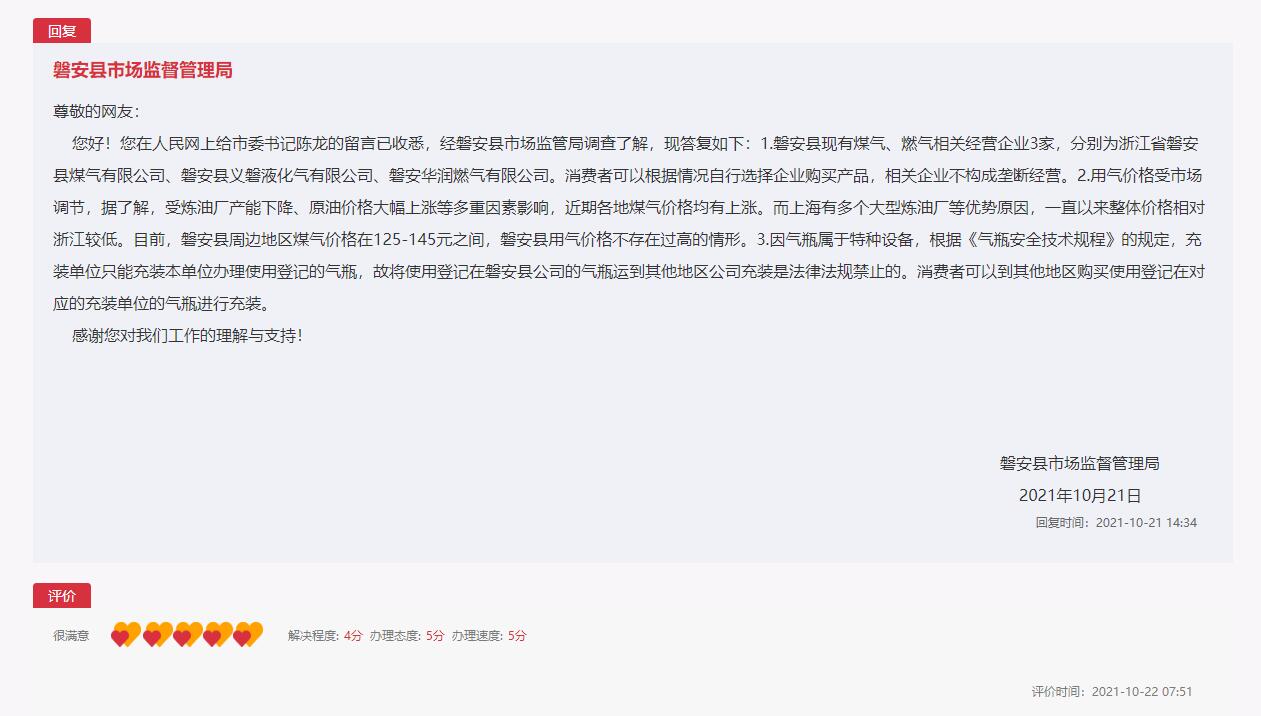 “用氣價格受市場調節!迸桶部h市場監督管理局在回復中表示,受煉油廠產能下降、原油價格大幅上漲等多重因素影響,近期各地煤氣價格均有上漲。而上海有多個大型煉油廠等,所以整體價格相對浙江較低。目前,磐安縣周邊地區煤氣價格在125到145元之間,磐安縣用氣價格不存在過高的情形。
