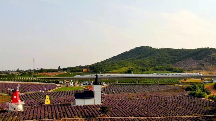 動車組列車飛馳經過商合杭高鐵巢湖尖山湖薰衣草花海。劉振華攝
