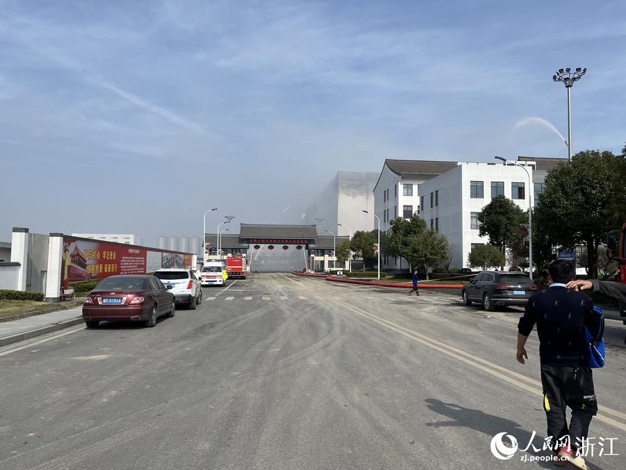 今天中午12時14分,記者在現場看到,多輛消防車停在會稽山酒廠附近,F場2臺灑水設備正對事故倉庫進行灑水,進一步降低倉庫溫度,防止復燃。