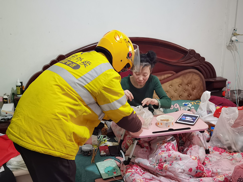 進門后的葉陽輝看到了這樣的景象:一位瘦弱蒼白的女士癱在床上,床上堆滿了各種生活用品?吹酵赓u來了,計旭鶯掙扎著想從床上坐起來。葉陽輝看出了計旭鶯身體不便,主動幫忙將小桌板支好,把飯菜擺好,方便她吃飯!澳且惶熳鐾赀@些,我就走了。第二次送餐的時候,我看到房里有垃圾,就跟她說順手把垃圾帶走!比~陽輝說,他估算過計旭鶯的用餐時間大概需要15分鐘。在這期間,葉陽輝會選擇暫時關閉自己的接單系統,不再繼續接單,好讓自己有充足的時間等待計旭鶯吃完飯。