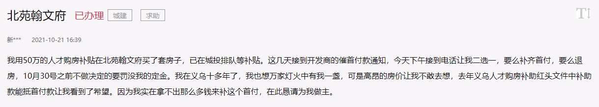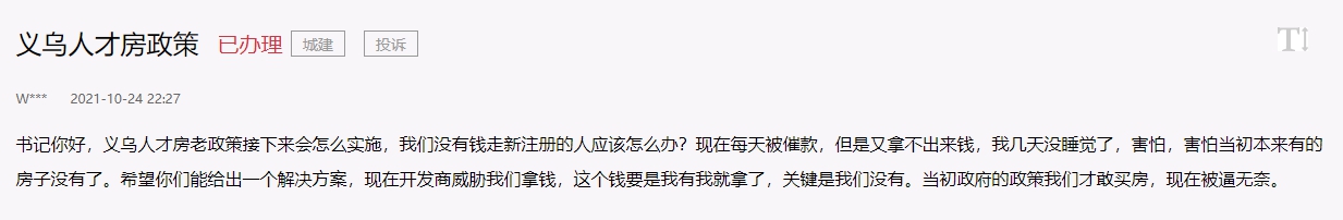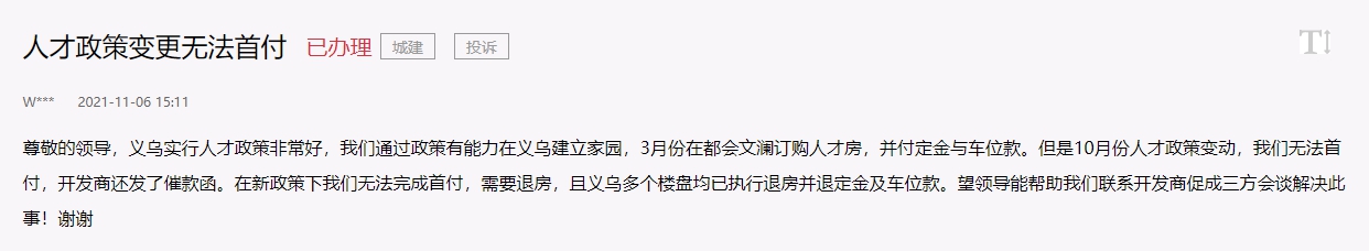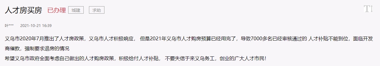 此舉一出,便受到了義烏人才的廣泛歡迎,但由于申請人數超出預期,造成了人才排隊的情況。今年10月下旬起,便有不少義烏網友接連在人民網“領導留言板”上反映,因審核通過的人才補貼遲遲不能到位,自己面臨被開發商催款、強制要求退房的情況。