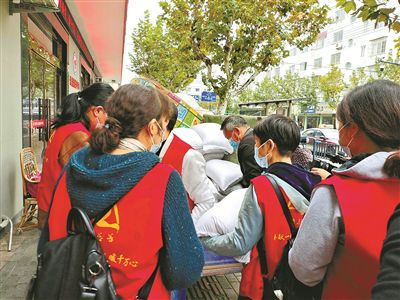 慈善義工們正在領取訂購的大米。李佳攝