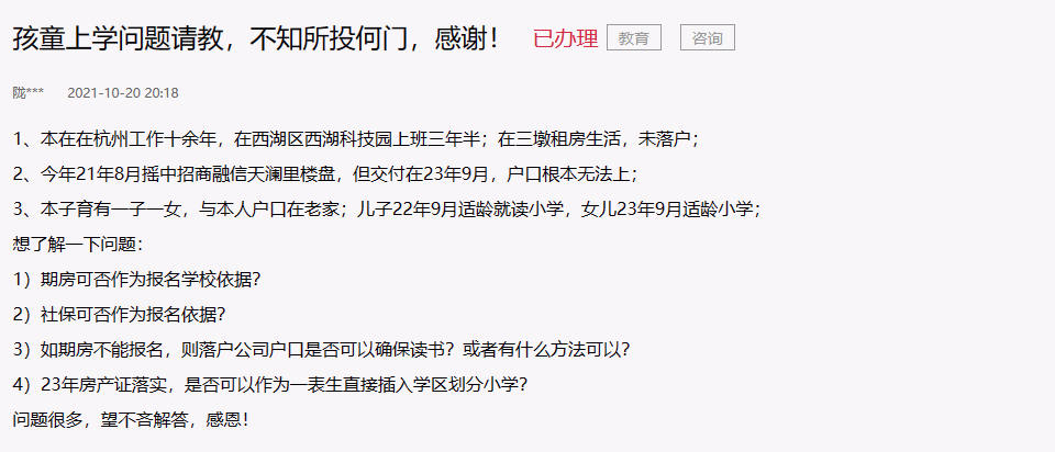 該網友在留言中提到,家中有兩個孩子,明后年將讀小學。今年8月,該網友搖號中簽杭州一處樓盤,但房子要等到2023年9月才能交付,現無法落戶。