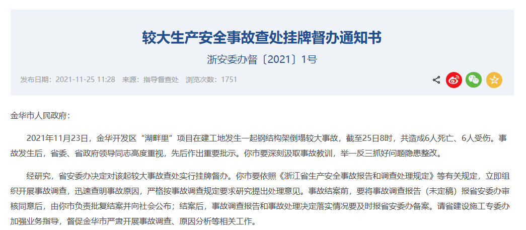 根據11月25日浙江省應急管理廳發布的《較大生產安全事故查處掛牌督辦通知書》,浙江省安委辦決定對該起較大事故查處實行掛牌督辦,要求金華市依照《浙江省生產安全事故報告和調查處理規定》等有關規定,立即組織開展事故調查,迅速查明事故原因,嚴格按事故調查規定要求研究提出處理意見。事故結案前,要將事故調查報告(未定稿)報浙江省安委辦審核同意后,由金華市負責批復結案并向社會公布;結案后,事故調查報告和事故處理決定落實情況要及時報浙江省安委辦備案。同時,浙江省建設施工專委辦將加強業務指導,督促金華市嚴肅開展事故調查、原因分析等相關工作。