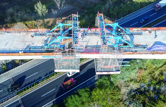 11月25日,在金甬鐵路金華東陽段施工現場,隨著最后一車混凝土成功注入鋼模板,跨甬金高速特大橋125米大跨連續梁合龍段澆筑完成,標志著金甬鐵路進入加速建設階段。這是金甬鐵路全線首聯跨高速公路連續梁,也是金甬鐵路東陽段首個合龍的最大跨度連續梁。(時寬兵)