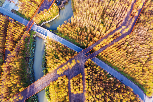11月27日,無人機航拍金華蘭溪市揚子江海綿城市公園,層林盡染景如畫。據悉,建設揚子江海綿城市公園前,這里河道淤積、養殖污染問題突出。自2016年開始,當地利用“滲”“滯”“蓄”“凈”“用”“排”等手段,通過水下系統、水生植物、樹木等自然濕地凈化系統全面打造海綿示范公園。目前,揚子江水質由建設前的劣V類提升到III類水的標準,通過凈化后的河水,可以直接用于農田灌溉、綠化灌溉、公園用水、消防用水。(胡肖飛)