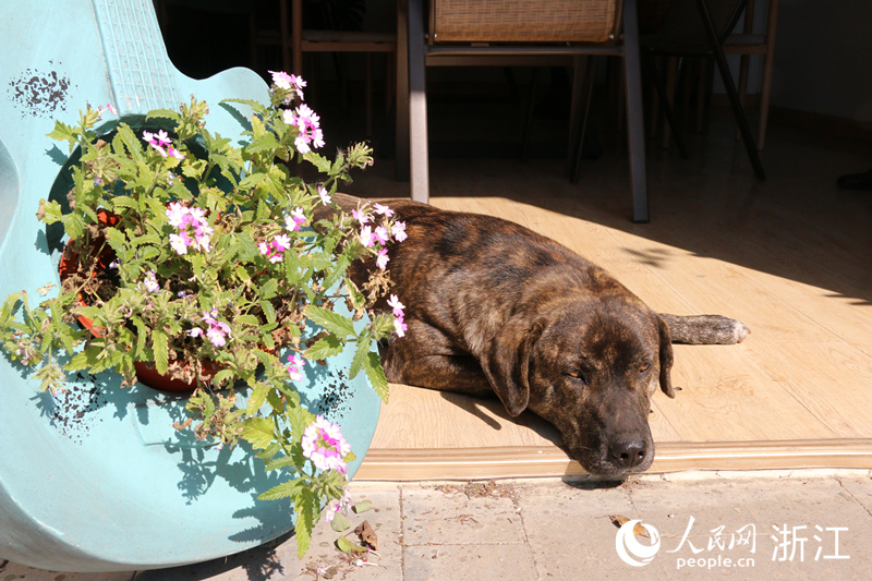 林曉家的狗在花壇旁悠閑地曬太陽。人民網 王蕭蕭攝