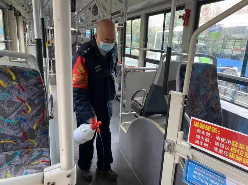 杭州公交相關工作人員對公交車進行消殺。杭州公交供圖