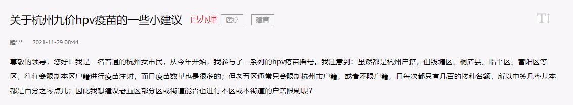 該網友在留言中表示,從今年開始她參與了一系列的HPV疫苗搖號,發現雖然都是杭州戶籍,但錢塘區、桐廬縣、臨平區、富陽區等往往會限制本區(縣)戶籍進行疫苗注射,而且疫苗數量也是很多的;但“老五區”(現已部分撤并)通常只會限制杭州市戶籍,或者不限戶籍,且每次都只有幾百個接種名額,所以中簽幾率基本都是百分之零點幾,因此她建議“老五區”部分區或街道也進行本區或本街道的戶籍限制。