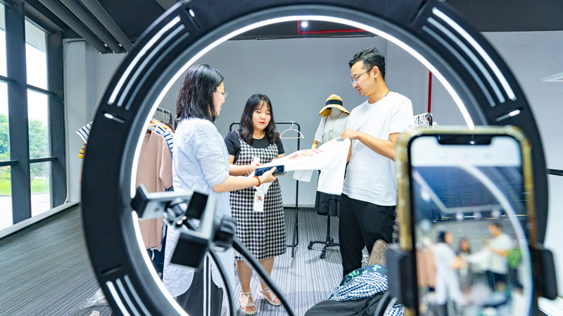 一部手機、一個麥克風、一臺電腦、幾盞補光燈,主播們對著鏡頭熱情洋溢地介紹產品,在寧波江北的寧波(前洋)直播中心里,每天都能看到這樣的場景。