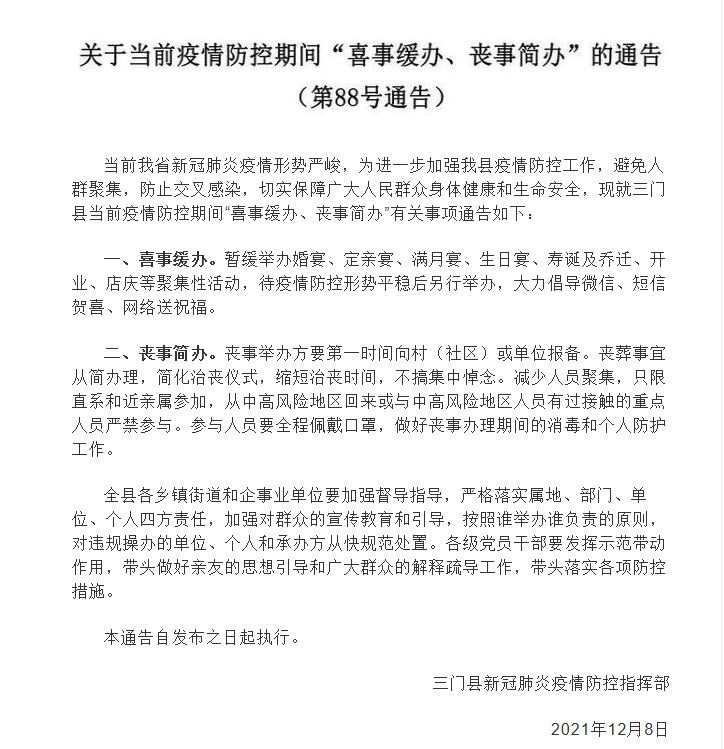 12月8日,三門縣就當前疫情防控期間“喜事緩辦、喪事簡辦”有關事項通告,暫緩舉辦婚宴、定親宴、滿月宴、生日宴、壽誕及喬遷、開業、店慶等聚集性活動。喪葬事宜從簡辦理,簡化治喪儀式,縮短治喪時間,不搞集中悼念。減少人員聚集,只限直系和近親屬參加,從中高風險地區回來或與中高風險地區人員有過接觸的重點人員嚴禁參與。參與人員要全程佩戴口罩,做好喪事辦理期間的消毒和個人防護工作。