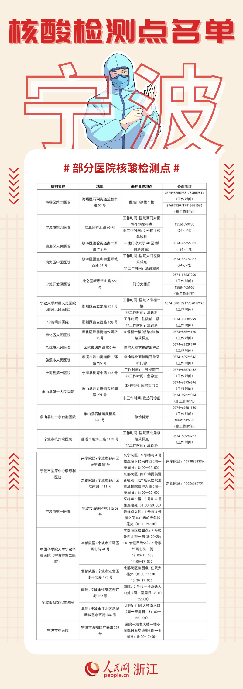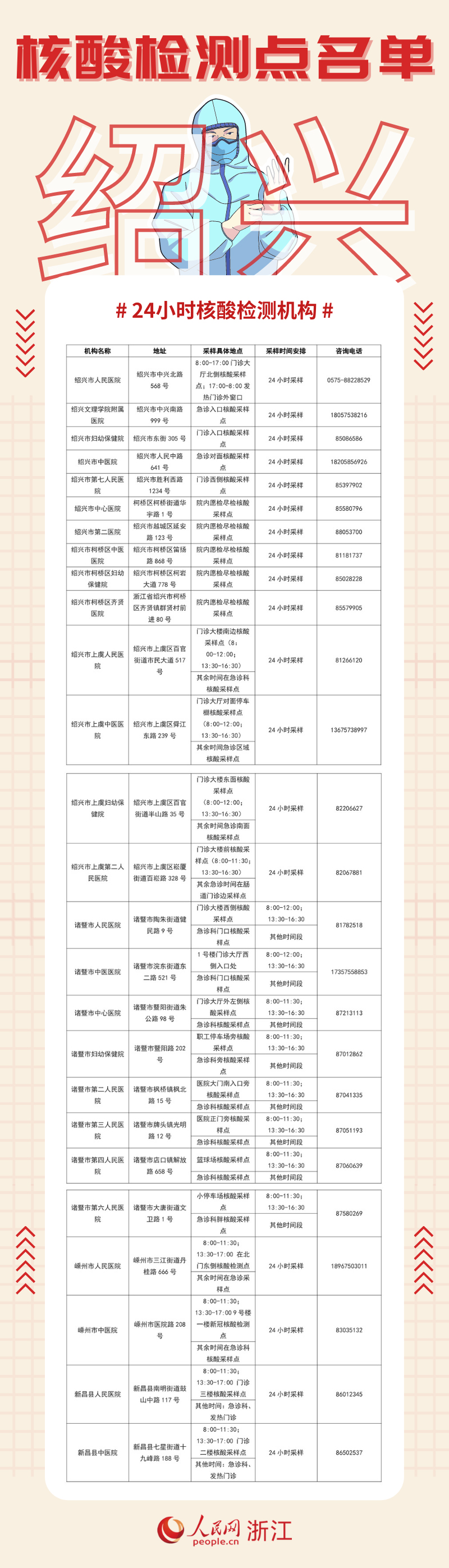 連日來,浙江寧波、紹興、杭州三地出現多例新冠肺炎確診病例和無癥狀感染者。當前疫情形勢復雜嚴峻,如何守住“綠碼”成了不少市民關心的問題。與此同時,市民們做核酸檢測的需求也相應增多,人民網浙江頻道梳理了杭紹甬三地24小時核酸檢測服務醫療機構和綜合服務點名單,助力大家守好“綠碼”。