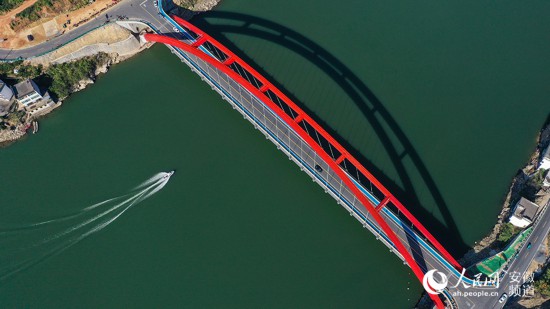 航拍的鏡頭下,街口大橋的紅色橋身尤為顯眼。新安江上的這短短“一橫”,拉近了皖浙兩地的距離,溫暖了人心,更帶來了活力。