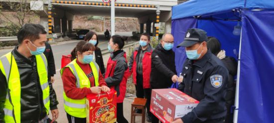 上張鄉賢聯席會為執勤點工作人員送上防疫物資。陳文武攝
