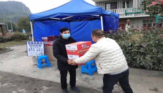 志愿者為大戰鄉防疫執勤點工作人員送上防疫物資?掠紨z