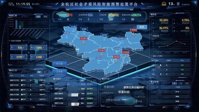 行政區劃優化調整后,余杭區仍面臨著流動人口多、民營企業多、建筑工地多以及糾紛存量大的現實問題。余杭區推出了社會矛盾風險智能預警處置平臺,將余杭全區矛盾糾紛“一本賬”量化管理,實現從“單一矛盾糾紛化解”向“預先研判未來風險”的轉變。