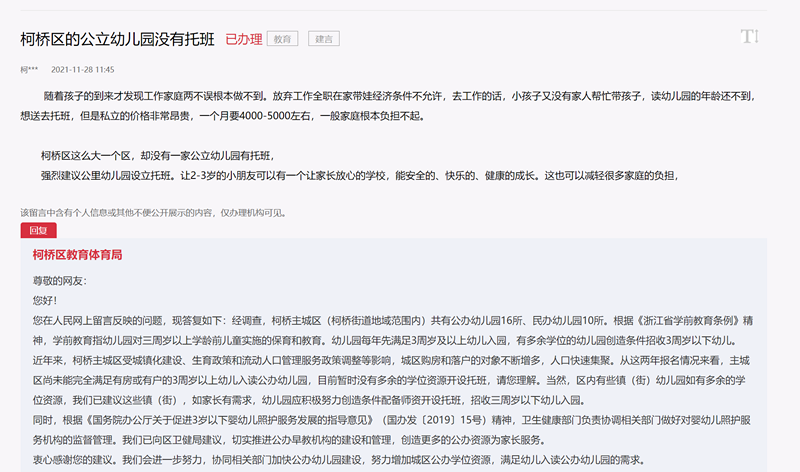 “隨著孩子的到來才發現工作家庭兩不誤根本做不到。放棄工作全職在家帶娃經濟條件不允許,去工作的話,小孩子又沒有家人幫忙帶孩子……”紹興一網友在人民網“領導留言板”上反映,自家小孩因還未滿幼兒園入園年齡,因此只能送去上托班。但他所在的柯橋區沒有一家公立幼兒園設有托班?紤]到私立托班價格昂貴,每個月收費在4000至5000元左右,家庭實在負擔不起。該網友因此建議,柯城區在公辦幼兒園內設立托班,讓3歲以下的小朋友可以有一個讓家長放心的托育場所,能安全、快樂、健康地成長。