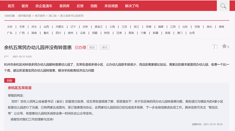 杭州市余杭區五常街道一網友在人民網“領導留言板”上反映,所在街道小區很多,但配套公辦幼兒園卻很少,而且距離家都比較遠!半x家近的基本都是民辦幼兒園,收費一個比一個高,建議抓緊落實民辦幼兒園轉普惠,解決學前教育經濟壓力問題!