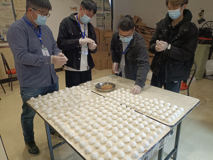 清晨一早,隔離點的5個大男人就開始忙碌起來。平時較少下廚的他們對于搓湯圓還是表示信心滿滿。揉皮、放餡、搓圓、下水、出鍋、裹豆粉、打包、配送,確保每個隔離人員能吃上最熱騰的、最地道的冬至湯圓。