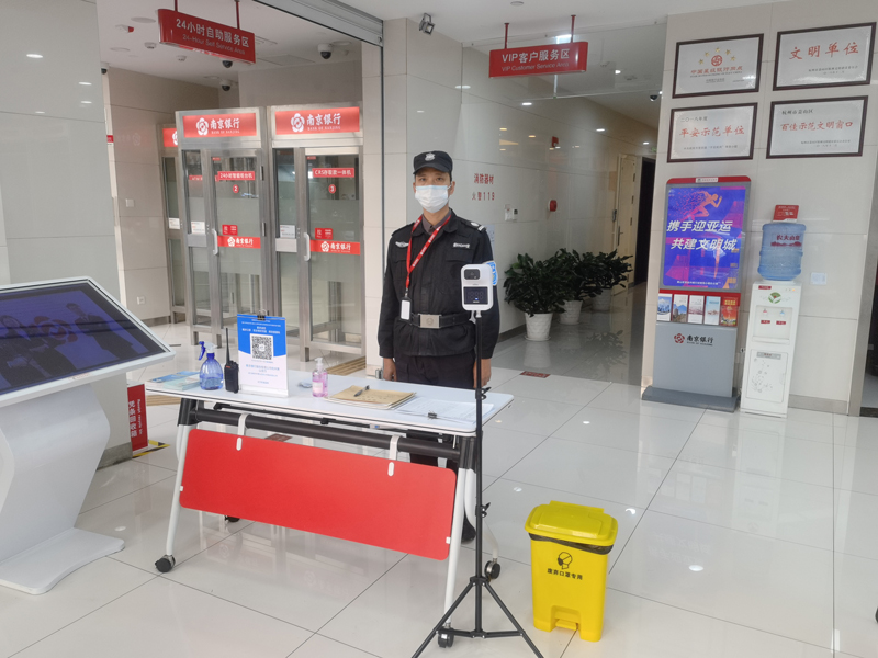 疫情期間,南京銀行蕭山支行設立專門測溫點,嚴格落實疫情防控相關舉措。南京銀行杭州分行供圖