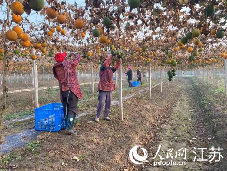農戶在見龍村瓜蔞產業園采收瓜蔞。靖江市委組織部供圖