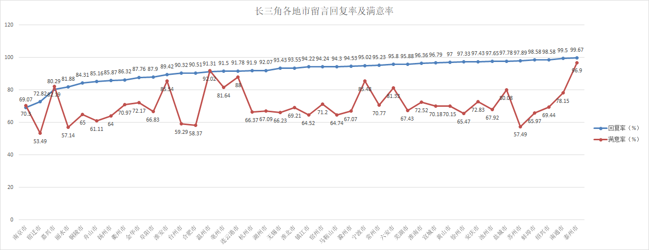 滿意率排名二至十名則是浙江省溫州市、江蘇省連云港市、江蘇省淮安市、浙江省寧波市、浙江省嘉興市、安徽省亳州市、安徽省六安市、江蘇省鹽城市、江蘇省南通市。