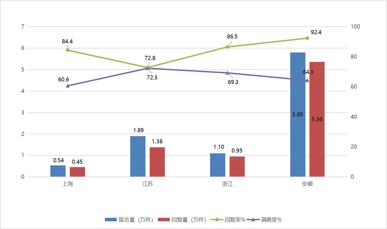 群眾留言量排名二至十名分別為安徽省阜陽市、安徽省亳州市、浙江省杭州市、江蘇省南京市、江蘇省蘇州市、安徽省六安市、安徽省安慶市、安徽省宿州市、浙江省紹興市。