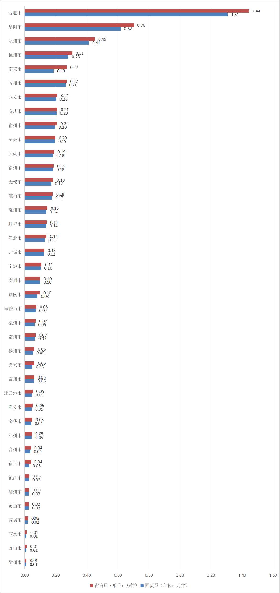 各地市中,群眾留言量最多的是安徽省合肥市,為1.44萬件。同時,回復量最多的也是合肥市,為1.31萬件。