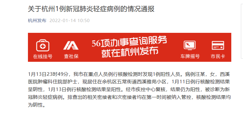 據杭州發布消息,1月13日23時49分,杭州市在重點人員例行核酸檢測時發現1例陽性人員。病例汪某,女,西溪醫院腫瘤科住院部護士,現居住在杭州市余杭區五常街道西溪雅苑小區,1月11日例行核酸檢測結果呈陰性,1月13日例行核酸檢測結果呈陽性。經杭州市疾控中心復核,結果仍為陽性,被診斷為新冠肺炎輕癥病例。排查出的相關密接者和次密接者均在第一時間被納入管控,核酸檢測結果均為陰性。